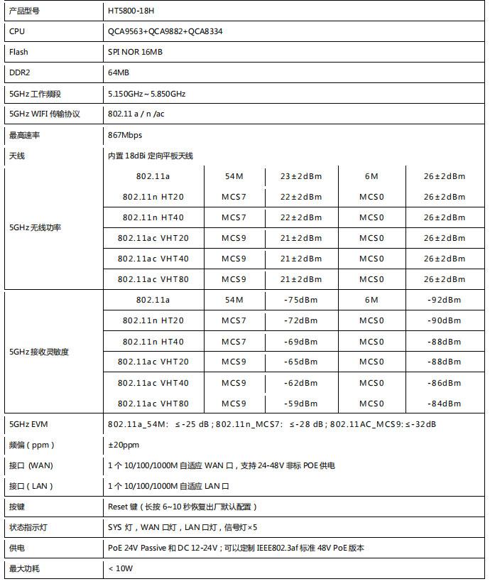 產(chǎn)品特點一、產(chǎn)品概述HT5800ac-18H是一款高性能、高速率的室外遠(yuǎn)距離無線網(wǎng)橋,它具有傳輸距離遠(yuǎn),穿透能力強,防干擾能力強等特點。二、產(chǎn)品特性l 使用專用的TVS防雷器件,提高了產(chǎn)品在惡劣環(huán)的能力l 內(nèi)置18dBi雙極...