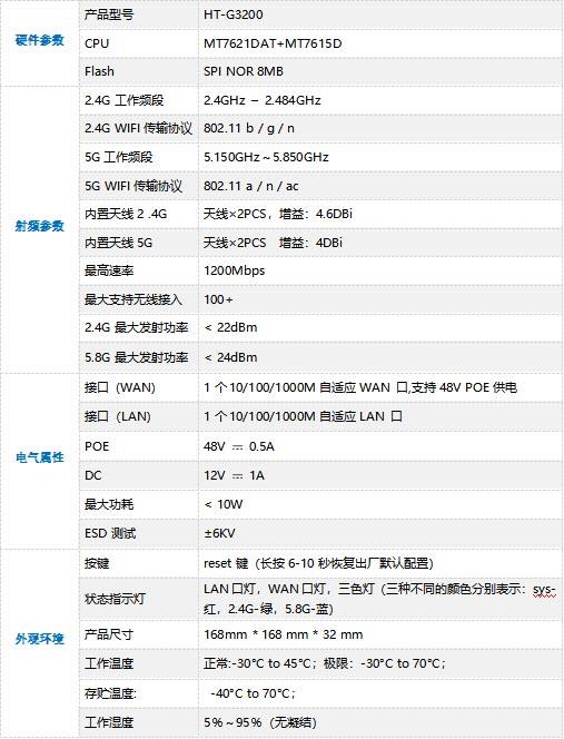 產(chǎn)品特點(diǎn)產(chǎn)品簡(jiǎn)介 HT-G3200雙頻無線大功率AP可同時(shí)工作在2.4GHz/5GHz兩個(gè)頻段,支持900Mbps 11AC(5GHz)和300Mbps 11N(2.4GHz),支持最大接入100+,最高無線速率可達(dá)1200Mbps,可接入更多無線客戶端,解決能源行...