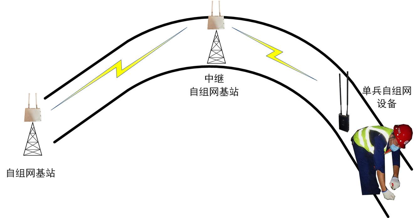 本方案基于自組網(wǎng)技術(shù)構(gòu)建,自組網(wǎng)系統(tǒng)具有配備靈活、部署簡便、功能穩(wěn)定的優(yōu)點。地下隧道的環(huán)境模型較為簡單,為狹長的走廊型環(huán)境。中訊慧通具有多款功率較大的自組網(wǎng)基站,可以根據(jù)現(xiàn)場環(huán)境,將自組網(wǎng)基站架設(shè)在網(wǎng)絡(luò)接入點附近,利用其他的自組網(wǎng)基站進(jìn)行信號中繼,將信號延伸到施工地點,工人可利用配備的單兵自組網(wǎng)設(shè)備進(jìn)行網(wǎng)絡(luò)接入和數(shù)據(jù)回傳。