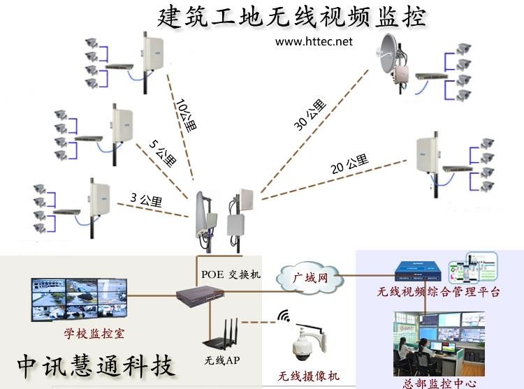 本次方案就采用了WLAN無(wú)線監(jiān)控,工地內(nèi)部使用無(wú)線網(wǎng)接入,外部使用ADSL或LAN接入互聯(lián)網(wǎng)。