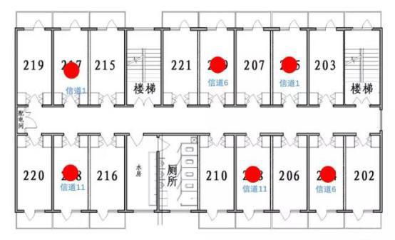 建議把AP安裝在宿舍內(nèi),覆蓋本宿舍和相鄰宿舍。如圖所示,平均分布安裝位置。2.4GHz頻道建議要合理規(guī)劃信道,在面向公眾的無線網(wǎng)絡(luò)中,2.4GHz信道帶寬設(shè)置為20MHz,不建議使用40MHz,(僅針對802.11ac ap)。