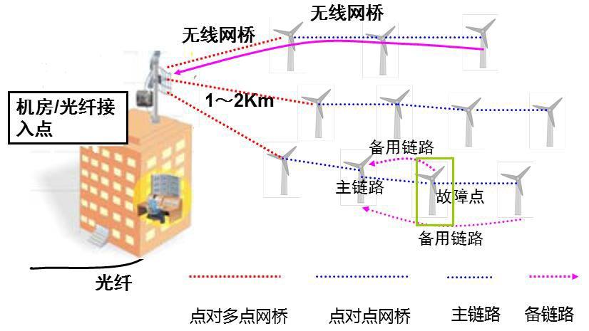 風電場一般位于野外山嶺或沿海高地,交通不便,地形復雜,且面積廣闊,跨度數(shù)公里,有線部署的難度遠遠大于無線。風塔或監(jiān)控探頭之間的光纖一旦斷掉,排查、修復耗時耗力。