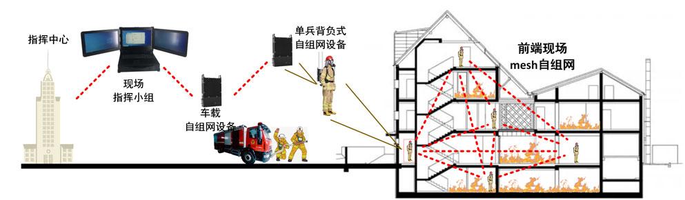在自然災(zāi)害現(xiàn)場的消防應(yīng)急場景離不開應(yīng)急通信裝置的配備,如洪澇、海洋、地質(zhì)災(zāi)害和森林草原火災(zāi)等。這些自然災(zāi)害往往伴隨著公網(wǎng)癱瘓、道路和電力中斷、惡劣天氣等極端復(fù)雜情況,我們通常要面臨著基礎(chǔ)設(shè)施(公網(wǎng)基站、線路、交換路由設(shè)備等)遭到破壞,災(zāi)區(qū)通信網(wǎng)絡(luò)與外界通信中斷,導(dǎo)致信息上傳下達(dá)難的困難。在消防應(yīng)急救援時(shí)面臨這些難題,通過超遠(yuǎn)距離圖像MESH中繼設(shè)備可以以前方指揮部或者前突小分隊(duì)的衛(wèi)星便攜站為中心,快速架設(shè)組網(wǎng)解決我們消防應(yīng)急通信的困難。超繞射穿透能力的MESH自組網(wǎng)電臺可以在樓層、隧道、地下環(huán)境中使用,實(shí)現(xiàn)10層空間的超穿透無線通信延伸覆蓋,面向大面積災(zāi)害現(xiàn)場,還可以實(shí)現(xiàn)空對地100公里范圍的反向廣域通信覆蓋。真正的解決我們在面臨線路破壞,通信中斷;電力中斷,基站癱瘓等這些極端環(huán)境下進(jìn)行應(yīng)急通信的難題。